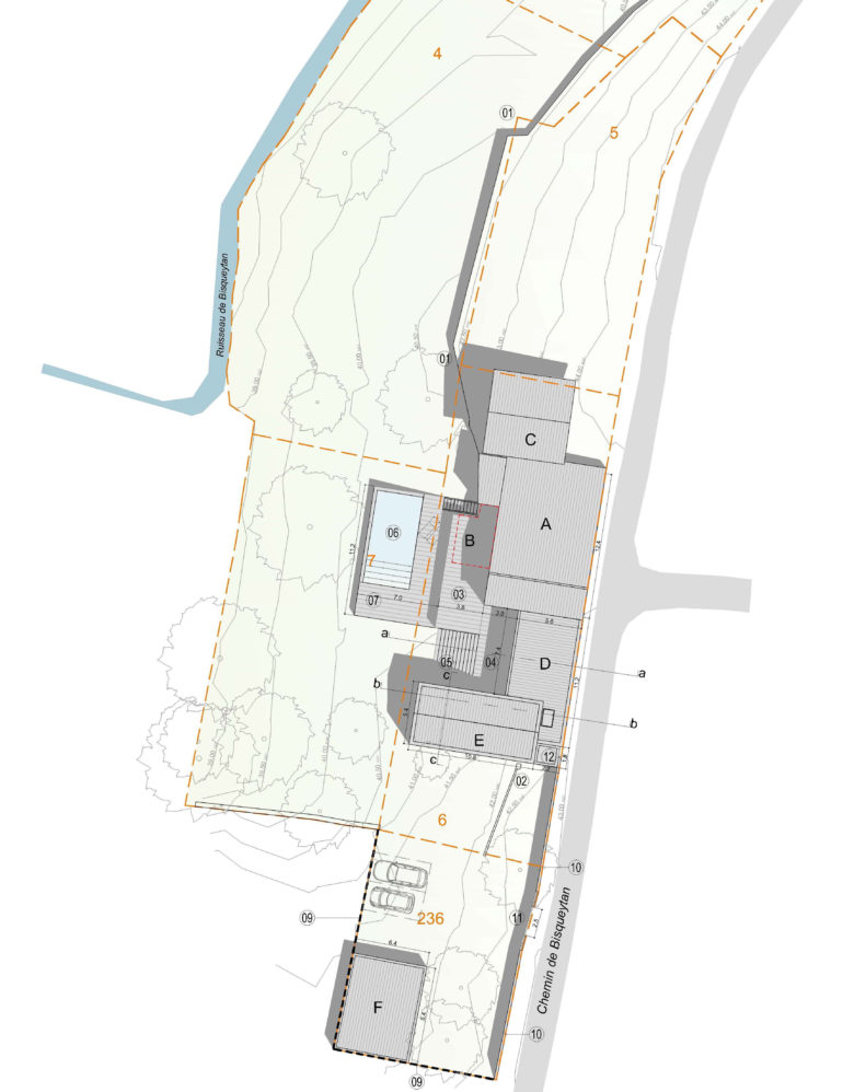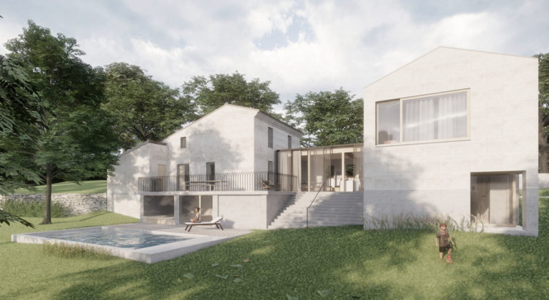 La maison existante fût bâtie par un tailleur de pierre qui vivait dans la carrière sur laquelle sera construite l’extension, pour ses enfants. C’est donc tout naturellement que le projet s’est orienté sur la mise en valeur de cette carrière qui accueillera une cave, mise en scène dans le niveau inférieur du volume de l’extension sud. La pierre locale sera utilisée comme matériau constructif, afin de prolonger l’histoire des lieux. Cette pierre s’inscrit dans une démarche constructive locale, avec des artisans locaux, et permet une faible empreinte carbone tout en conservant une bonne inertie de l’enveloppe.