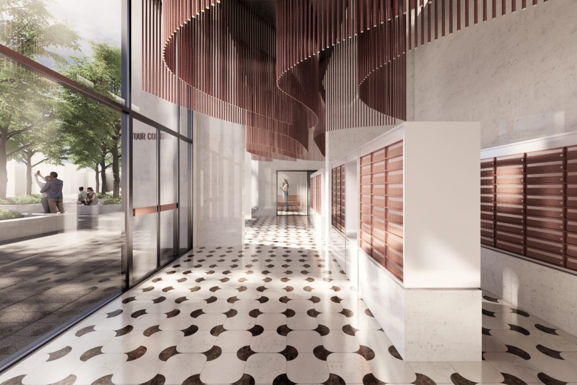 Enfin, le faux plafond sera animé par une composition de tubes métalliques suspendus, disposés selon une implantation courbe. Cet élément architectural apportera rythme et identité à l’espace, contribuant à créer un hall d’entrée accueillant, contemporain et distinctif.